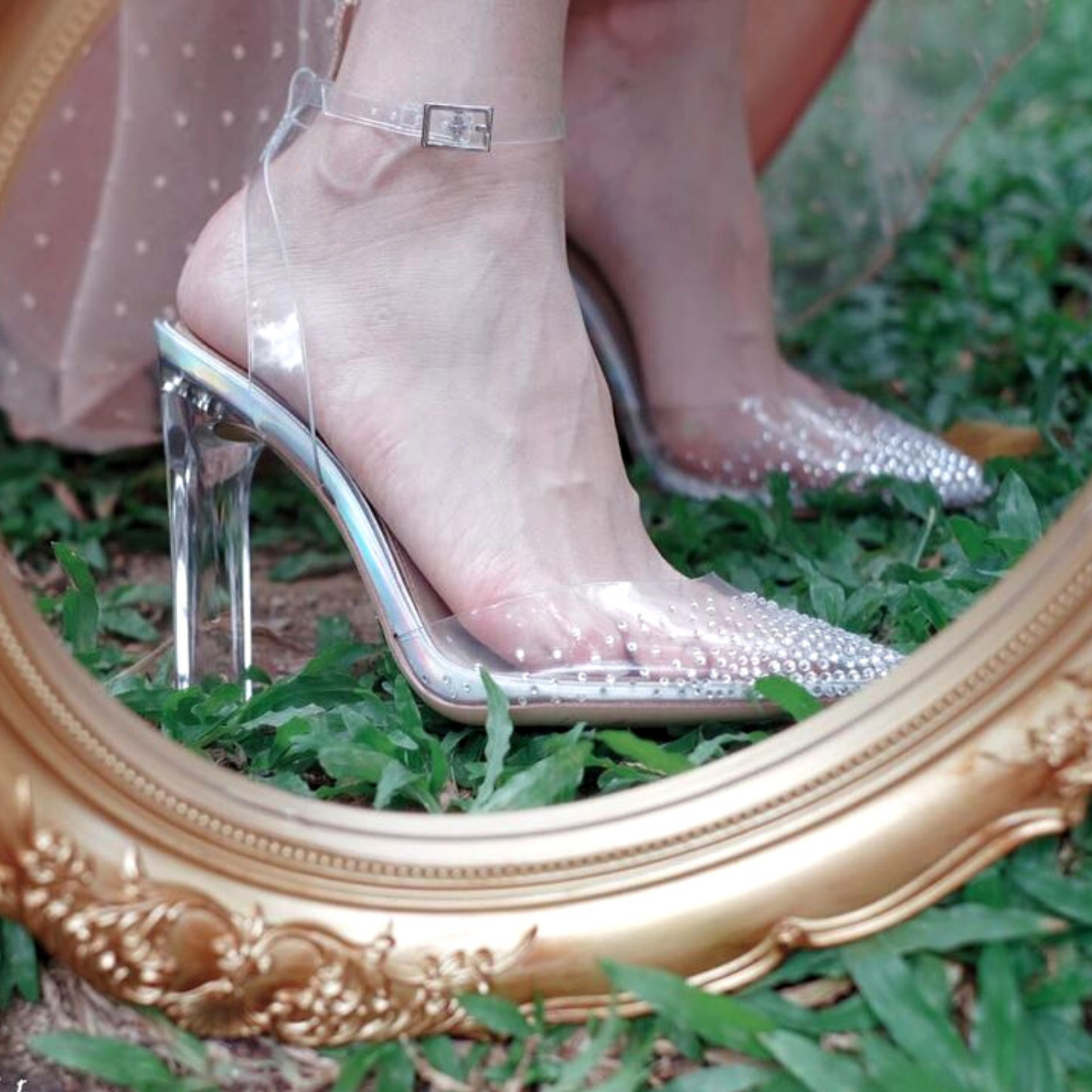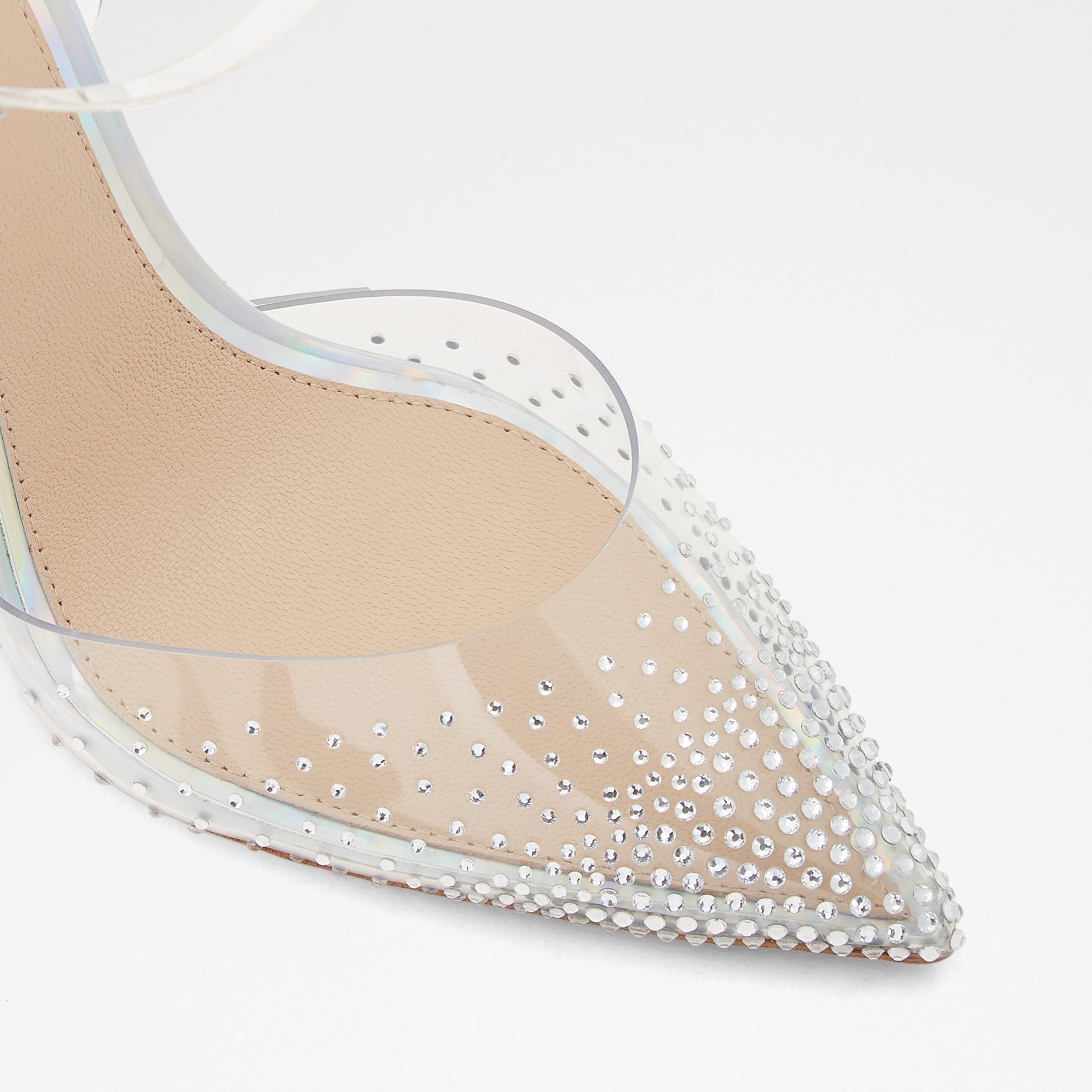 Sapato GLASSSLIPPER para senhora, em prateado, de salto em bloco, com acabamento em ponta bicuda e brilhos. Com fecho de fivela no tornozelo. Coleção Cinderella | Coleção exclusiva Disney x ALDO. Complete o seu look aqui.